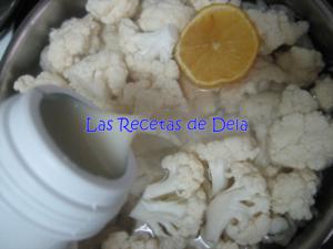 Mi madre me enseñó a cocer así la coliflor, es una forma de que quede blanca y tierna, y que no huela cuando se está cociendo. En una olla ponemos las flores de coliflor. Añadimos medio limón, sal y un chorreón de leche. Dejamos cocer hasta que quede tierna. Alrededor de 30 a 45 minutos. Comprobarlo pinchando en el tronquito de la coliflor.
