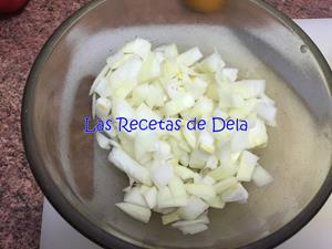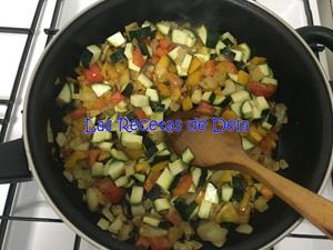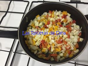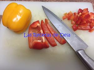 Mientras vamos lavando y cortando los pimientos en dados. Los añadimos a la sartén.