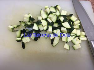 Lavamos y cortamos igual el calabacín. Lo incorporamos al sofrito.