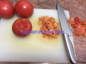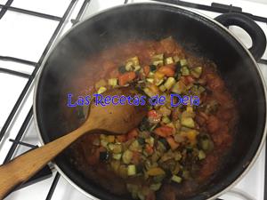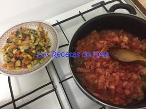 Cuando hayamos sacado y reservado la verdura, echamos los tomates en la sartén y dejamos que se pochen hasta que se haya frito bien. Si hace falta aceite se le añade.