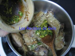 Majamos en el mortero el azafrán, la cucharada de almendras, un diente de ajo, perejil y la pimienta negra con un poco de sal gruesa. Una vez esté bien majado todo lo añadimos a la cacerola.