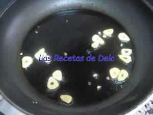 Una vez que se han cocido lo escurro bien todo. Pelo y corto en láminas unos ajos, la cantidad al gusto, y dejo que se doren en una sartén con un chorro de aceite.