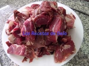 Vamos a utilizar la olla exprés para que lo hagamos en menos tiempo. Cortamos la carne en trozos, ni muy grandes ni pequeños (esto lo puede hacer el carnicero, pero yo tenía la carne en una pieza).