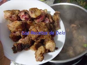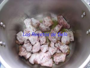 Ponemos un chorro de aceite y vamos dorando la carne que previamente la hemos sazonado y pasado por harina. Lo haremos por tandas, hay que dejar que se dore por fuera. Vamos reservando la carne en una fuente.