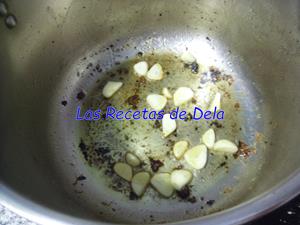En ese mismo aceite, si hace falta se añade algo más, ponemos los dientes de ajo en láminas gruesas. Ese fondo que queda de haber hecho la carne luego le va a dar sabor al guiso.