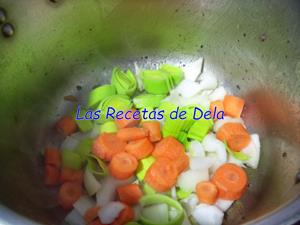 Cuando estén ligeramente dorados añadimos las verduras, ya peladas, limpias y troceadas y las rehogamos unos minutos.