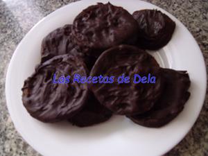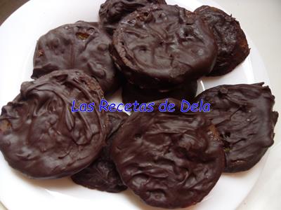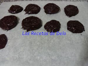 Ponemos en la encimera de la cocina papel de horno o film transparente. Vamos pasando las naranjas por el chocolate y las vamos colocando sobre el papel. Las dejamos que se enfríen y quede el chocolate de nuevo duro.
