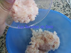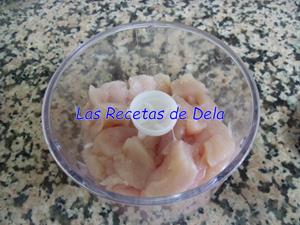 Troceamos la pechuga de pollo y la ponemos en la picadora, yo lo hice en dos tandas. Se puede comprar la carne de pollo ya picada de la pollería. Yo como compré una bandeja con varias pechugas, hice unos filetes bonitos para otro día y el resto lo hice para esta receta.