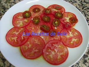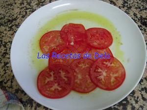 Cortamos los tomates en rodajas finas, que iremos colocando en el plato. Para que quede más bonito el plato se utilizarán las rodajas grandes, todas iguales, el resto del tomate se utilizará para otros usos.