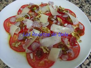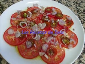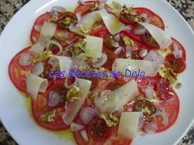 El carpaccio es un plato a base de láminas muy finas de carne, típico de Italia, pero hoy en día se puede hacer con cualquier producto, ya sean carnes, pescados, mariscos o verduras. En esta receta el protagonista es el tomate, pero hay que elegir un buen tomate, de esta forma el plato queda sensacional. No deja de ser una ensalada de tomate, en láminas finas con otros ingredientes y un buen aliño.