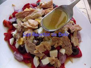 Batimos bien todo para que se mezcle y lo echamos por encima de la ensalada.