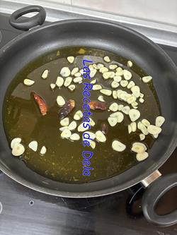 Pelamos y cortamos los ajos en láminas. Ponemos en una sartén amplia un buen chorro de aceite. Incorporamos los ajos con las guindillas y dejamos que se doren.