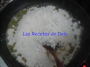 Se añade la harina y se rehoga muy bien. Este paso es importante para que la masa de las croquetas no tenga sabor a harina cruda.