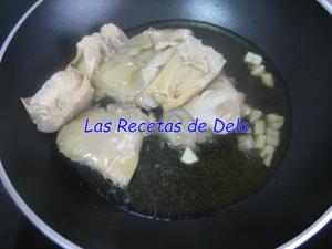 Ponemos una sartén al fuego con un chorro de aceite. Ponemos los ajos y dejamos que tomen un poco de color. Añadimos las alcachofas bien escurridas. Si son pequeñas partidas por la mitad y si son grandes en tres o cuatro partes, eso ya lo dejo a vuestro gusto. Las salteamos unos minutos. Añadimos el vinagre y dejamos un par de minutos más.