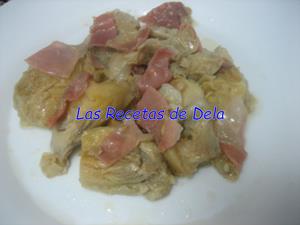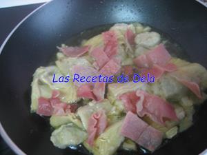 Incorporamos el jamón troceado y rehogamos un poquito. Si añadimos sal con las alcachofas hay que tener en cuenta el jamón serrano, que aportará su sal.