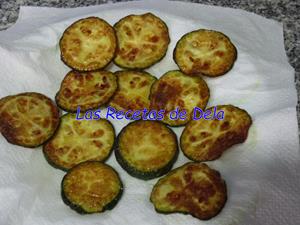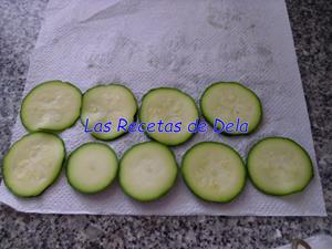 Cortamos el calabacín en rodajas finas y las ponemos sobre un papel absorbente con un poco de sal por encima. Las dejamos unos minutos para que suelten el agua. A continuación pondremos otra hoja encima para secarlas muy bien.