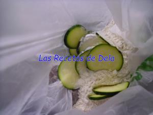 Echamos harina en una bolsa y metemos las rodajas por tandas, sólo las que se vayan a freír. Agitamos con la bolsa cerrada y así solo tomaran la harina justa.